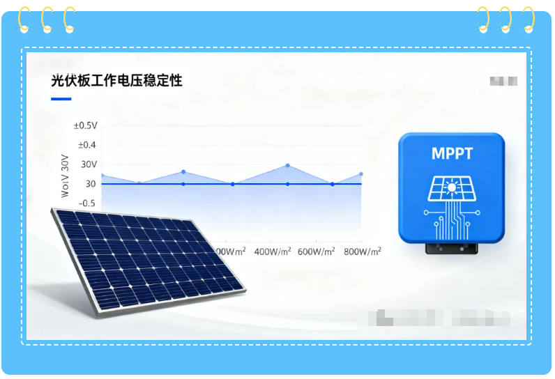 The operating voltage remains relatively stable within the “effective illumination range.” During normal power generation, the photovoltaic system uses an MPPT (Maximum Power Point Tracking) controller to precisely stabilize the operating voltage near the “maximum power point voltage (Vmp)” – as long as the light intensity is not lower than the starting threshold (generally 50-100 W/m², equivalent to weak light conditions on a cloudy day or in the evening), the operating voltage will not fluctuate significantly with changes in light intensity. For example, for a 250W solar panel, its Vmp is usually fixed at around 30V. Even if the light intensity increases from 300 W/m² to 800 W/m², the operating voltage fluctuation will be controlled within ±0.5V, which will not affect normal power generation.
